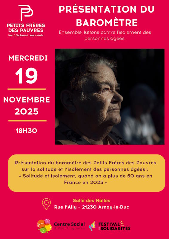 À l’occasion de Festisol, les Petits Frères des Pauvres d’Arnay-le-Duc présenteront le nouveau baromètre de l’association qui dresse un constat alarmant sur l’isolement et la solitude des personnes âgées. Vous découvrirez des chiffres inédits sur la Bourgogne-Franche-Comté qui permettent de mieux comprendre la réalité de nos aînés dans la région. Après cette présentation, Jeannine Sanchez, bénévole de « Carte Joviale », viendra partager une belle initiative à destination des aînés.