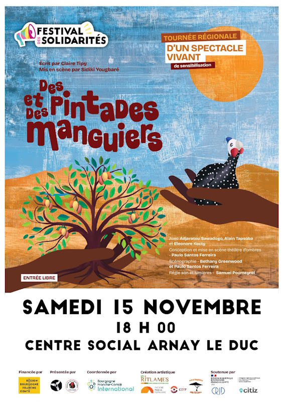 Cette année encore, de nombreuses animations vous seront proposées comme le spectacle de la tournée régionale « des pintades et des manguiers », une intervention des Petits Frères des Pauvres sur l’isolement des personnes âgées, une Ré-Veillée spéciale Festisol au Château d’Arnay, une exposition créée par les résidents du centre Adoma de Pouilly ou encore une semaine dédiée au bénévolat et pleins d’autres choses !