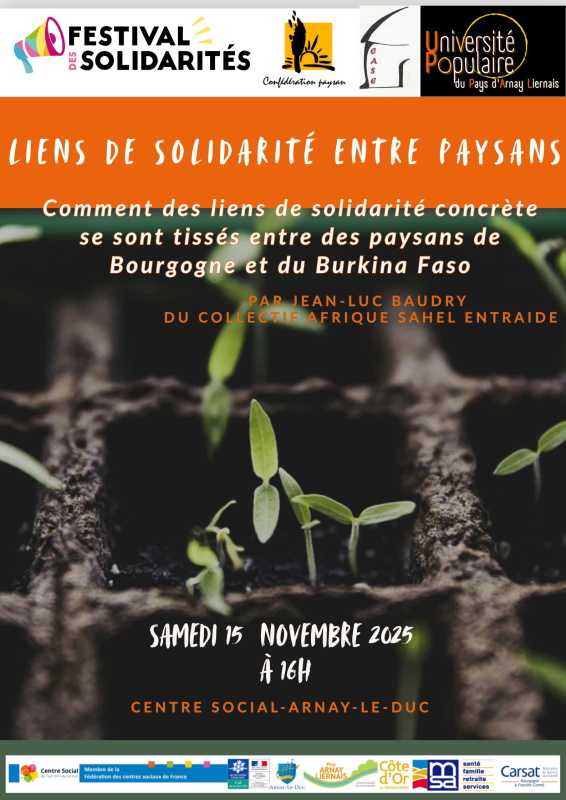 Jean-Luc Baudry, paysan engagé et ancien porte-parole de la Confédération paysanne, racontera comment des liens de solidarité concrète se sont tissés entre des paysans de Bourgogne et du Burkina Faso. Une autre mondialisation est possible : celle qui part du terrain, des luttes paysannes et de la souveraineté alimentaire ! Une expérience concrète d’échanges agricoles et humains, au service d’un développement local porté par les paysans eux-mêmes.