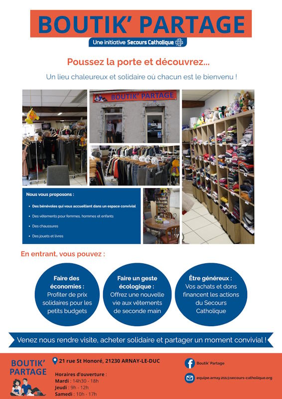 Venez partager un moment d’échange convivial autour de gourmandises et de boissons chaudes à la Boutik’ Partage du Secours Catholique. Vous pourrez profiter dans le même temps de vêtements d’occasion à prix solidaire ! Ouverture de la Boutik’ Partage de 10 h à 16 h au 21 rue St Honoré à Arnay-le-Duc.